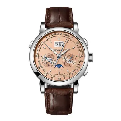 A Lange & Sohne Datograph 740.056 Pink Gold Dial Perpetual Tourbillon 41.50mm 18k White Gold Brown Leather Straps Men’s Watch