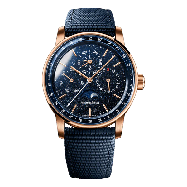 The watch features a 41mm case made of 18-carat rose gold, providing a touch of sophistication and durability. Its slim profile, with a thickness of 10.9mm, ensures a comfortable fit on the wrist. The blue aventurine dial and subdials add a touch of celestial beauty, complemented by 18-carat pink gold hour markers and hands. The lacquered blue inner bezel enhances the overall aesthetic appeal. The double curved sapphire crystal protects the dial from scratches and ensures clarity.