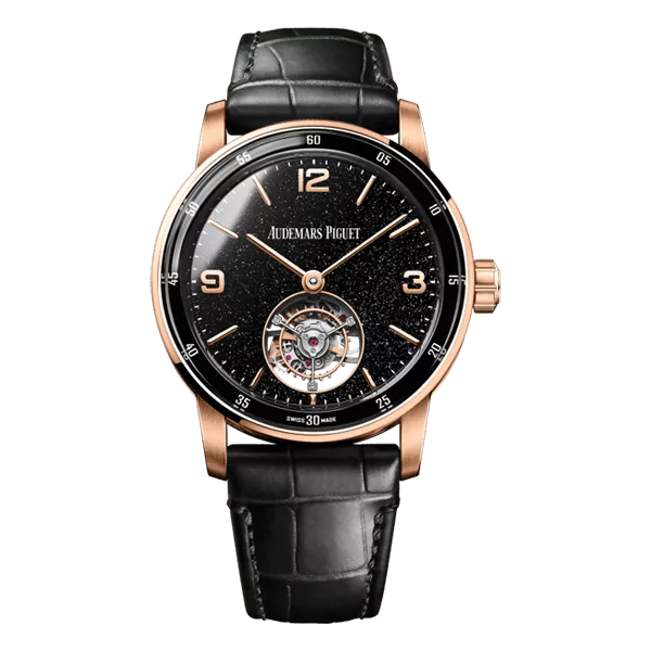 “The black aventurine enamel dial of the 18-carat pink gold selfwinding flying tourbillon gives the effect of a star-lit sky.”