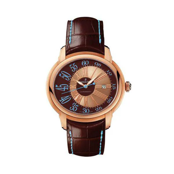Selfwinding watch with date display and centre seconds. 18-carat pink gold case, brown dial, brown strap. Availability to be confirmed. 18-carat pink gold case, glareproofed sapphire crystal and caseback. Brown lacquered dial, satin-brushed off-centred disc, blue printed Arabic numerals. Pink gold applied Roman numerals. Pink gold hands with luminescent coating.