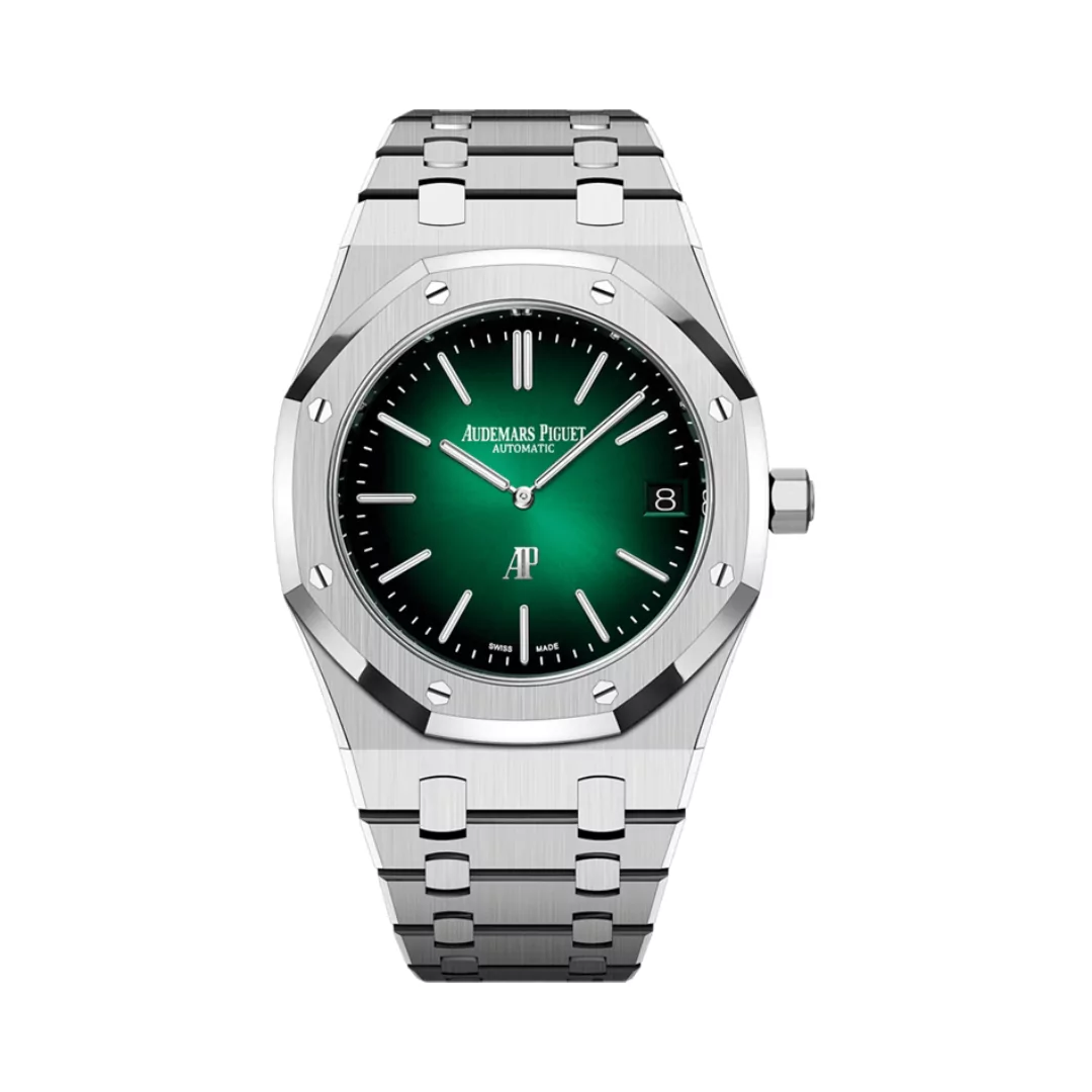 Dial: Smoked green dial with sunray pattern base, white gold applied hour-markers and Royal Oak hands with luminescent coating.