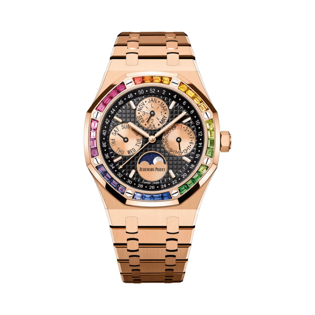 Audemars Piguet Royal Oak 26614OR.YY.1220OR.01 Perpetual Calendar Ltd Edition Rose Gold Black Dial Rainbow Bezel 41mm Men’s Watch