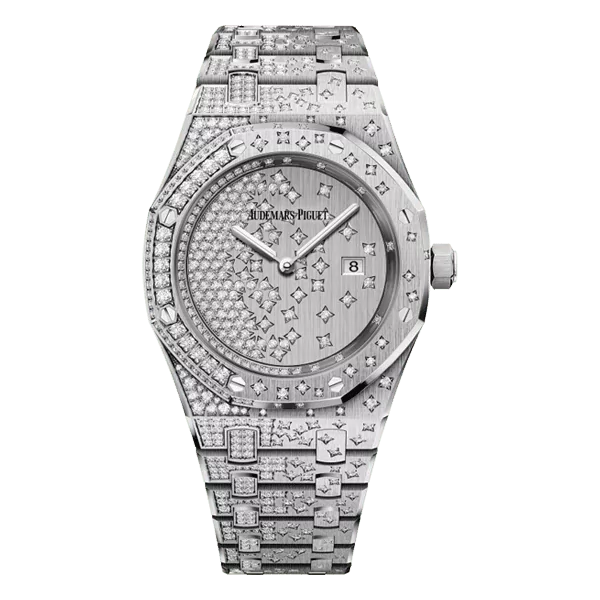 33 mm diamond-set 18K white gold case, 7 mm thick, glareproofed sapphire crystal, diamond-set 18K white gold dial with white gold Royal Oak hands with luminescent coating, Calibre 2713 quartz movement with hours, minutes, date, diamond-set 18K white gold bracelet, AP folding buckle. Water resistant to 50 meters.
