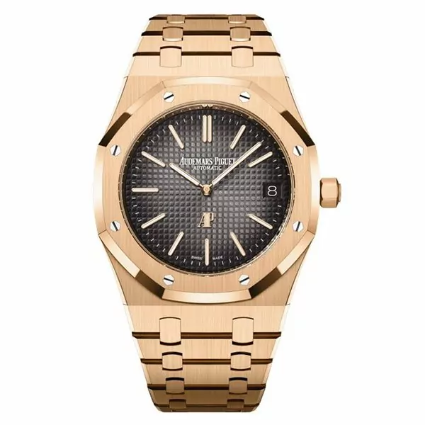 Dial: Smoked grey dial with “Petite Tapisserie” pattern, pink gold applied hour-markers and Royal Oak hands with luminescent coating.