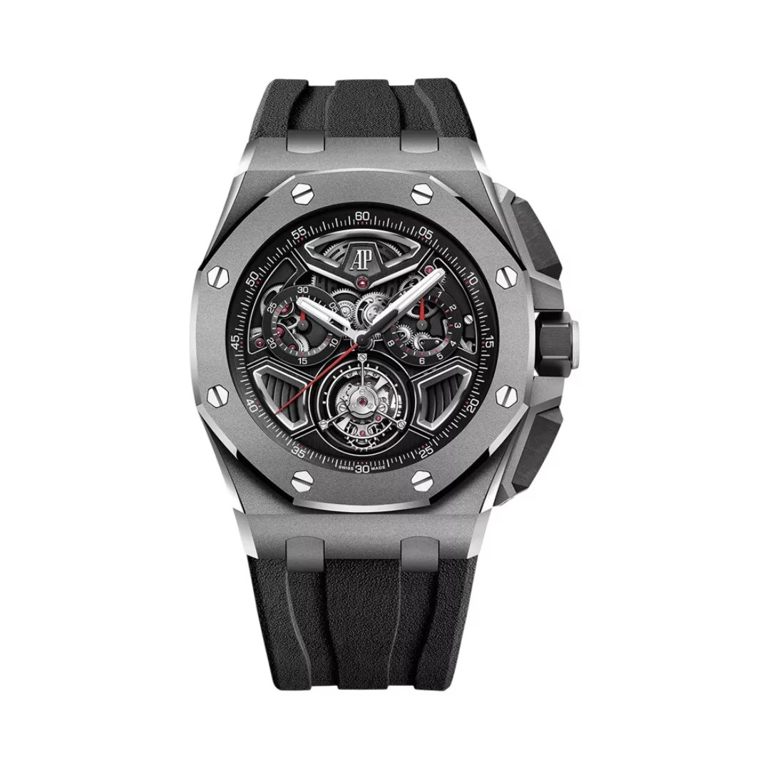 This Audemars Piguet Royal Oak Offshore 26622TI.GG.D002CA.01 is a stylish and powerful watch made for men. It comes with a strong 43mm titanium case that is shaped in the brand’s famous octagonal design. The case has a transparent back, letting you see the detailed movement inside. The titanium bezel adds extra strength while keeping the watch lightweight and comfortable.