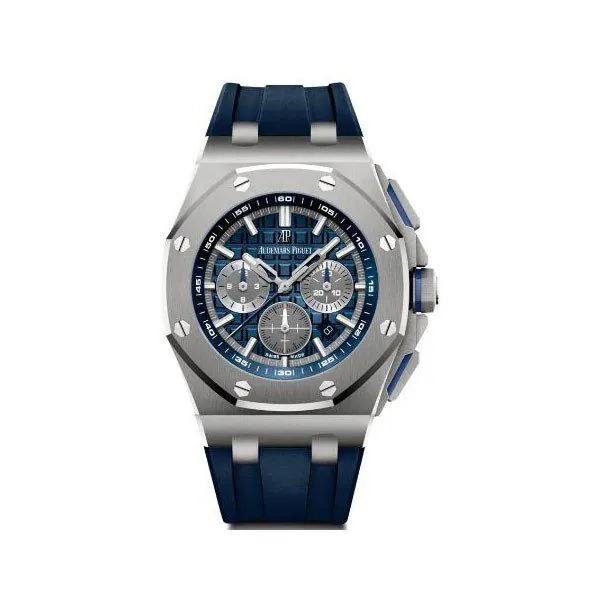 42mm titanium case, scratch resistant sapphire crystal, fixed bezel, screw-locked crown, blue dial with ?M?ga Tapisserie? pattern, grey counters, white gold Royal Oak hands with luminescent coating, power reserve 40 h, blue rubber strap with titanium pin buckle, water resistant to 100m/330ft.