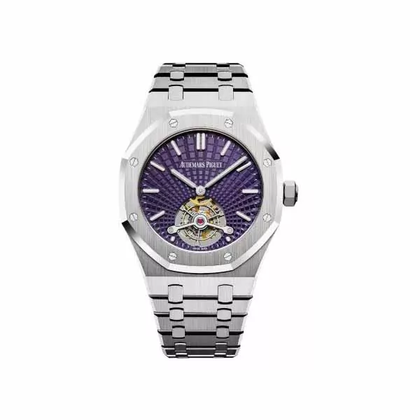 41mm stainless steel case, 9mm thickness, bezel set with baguette-cut gradated blue sapphires, glareproofed sapphire crystal and caseback, plum-toned dial with ?Tapisserie Evolutive? pattern and with the tourbillon taking pride of place seen for the first time, white gold applied hour-markers and Royal Oak hands with luminescent coating, folding clasp, hand winding movement, water resistant to 50m/165ft.