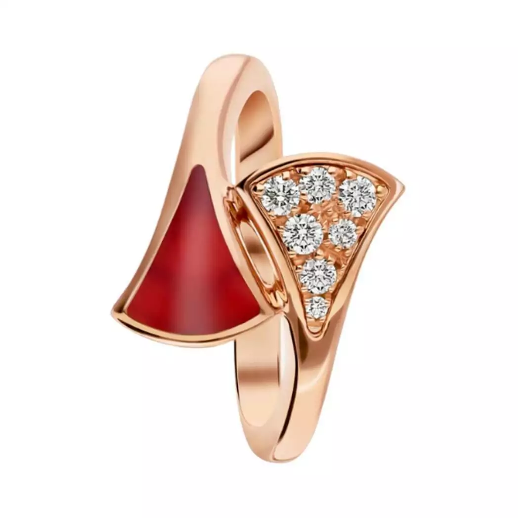 Made from genuine rose gold, the Bvlgari Divas Dream ring is a testament to quality craftsmanship. The use of 18 kt rose gold ensures both durability and a luxurious aesthetic. The addition of carnelian and pavé diamonds elevates the ring, adding a sparkle that captures attention.