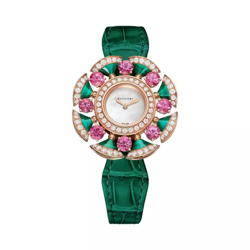 The Bvlgari Divas Dream Watch 103636 is a masterpiece of elegance and style. It features an exquisite 18 kt rose gold case, giving it a timeless and luxurious appeal. The watch is adorned with round brilliant-cut diamonds, malachite inserts, and pink tourmaline petals, adding a touch of glamour and sophistication to its design.