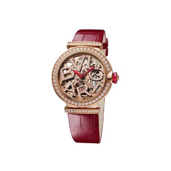 33mm 18kt rose gold case, Diamonds bezel, 18kt Rose gold crown set with a pink cabochon-cut stone and diamond, Red leather strap and 18K rose gold ardillon buckle, Skeleton execution, Automatic movement, water resistant to 50m/165ft.