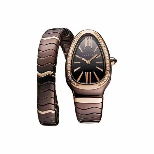 35 mm treated ceramic case, 18K rose gold crown set with a cabochon-cut ceramic element, 18K rose gold bezel with diamonds, brown dial, quartz movement with hour-minute functions, serpenti spiga single-spiral ceramic bracelet serpenti spiga single-spiral. Water resistant to 30 m.