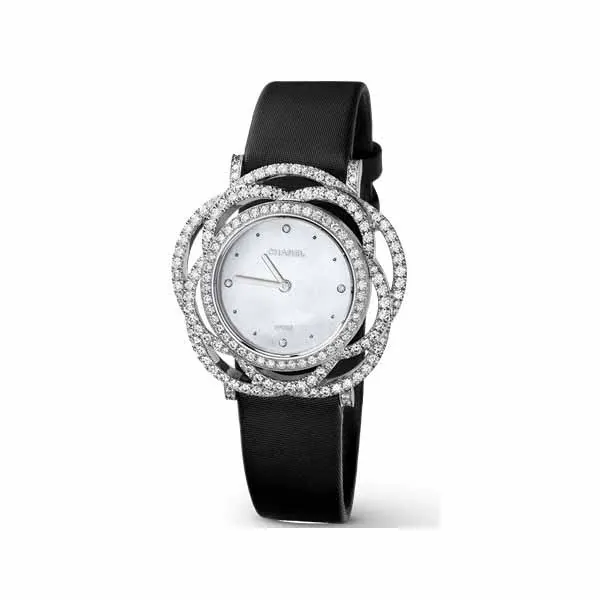 18kt white gold with diamonds case, mother of pearl dial, black satin strap, quartz movement, fixed bezel, scratch resistant sapphire crystal, water resistant to 30m/100ft.