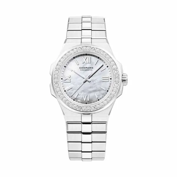 36.00 mm stainless steel case, sapphire back, screw-down crown, bezel set with diamonds, glareproofed scratch-resistant sapphire crystal, frosted white mother-of-pearl dial, Chopard caliber 09.01-C self-winding movement, approximately 42 hours of power reserve, stainless steel bracelet, folding buckle. Water resistant to 100 meters.