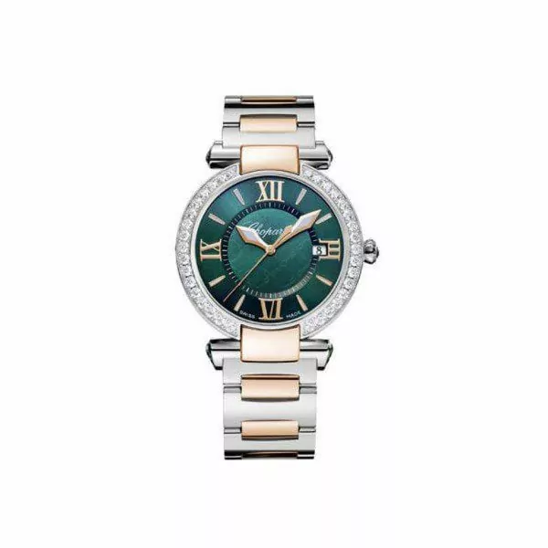 36mm 18K rose gold and stainless steel case, crown with tourmalines, diamond bezel, green dial, quartz movement with hours, minutes, seconds and date, 18K rose gold and stainless steel bracelet. Water resistant to 50 meters.