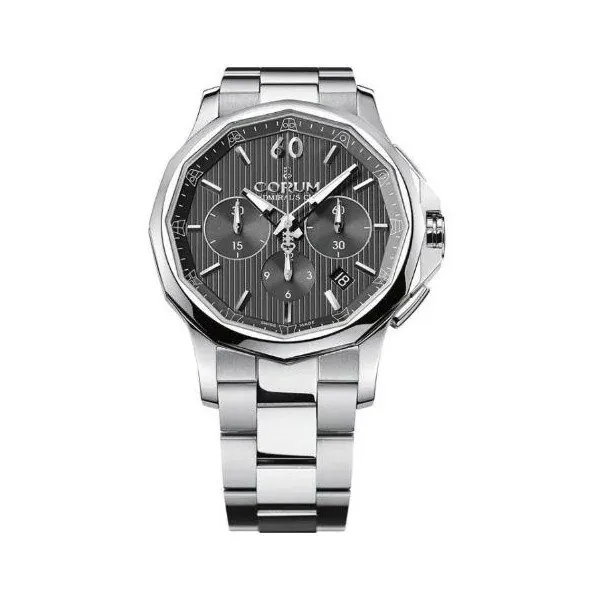 42mm stainless steel case, 11.60mm thick, transparent back with glare proof sapphire crystal, stainless steel bezel, sapphire crystal crystal with anti-reflective treatment, gray dial with hourly nautical pennants transferred on the flange, minute-circle indexes transferred on the flange, inscribed admiral’s cup transferred on the dial, guilloche finishing, applied rhodium-coated hour indexes, corum logo applied on the dial, caliber co 984 automatic movement with hours, minutes, chronograh, small seconds, date, approximately 42 hours of power reserve, stainless steel bracelet, triple folding clasp buckle. Water resistant to 3 atm.