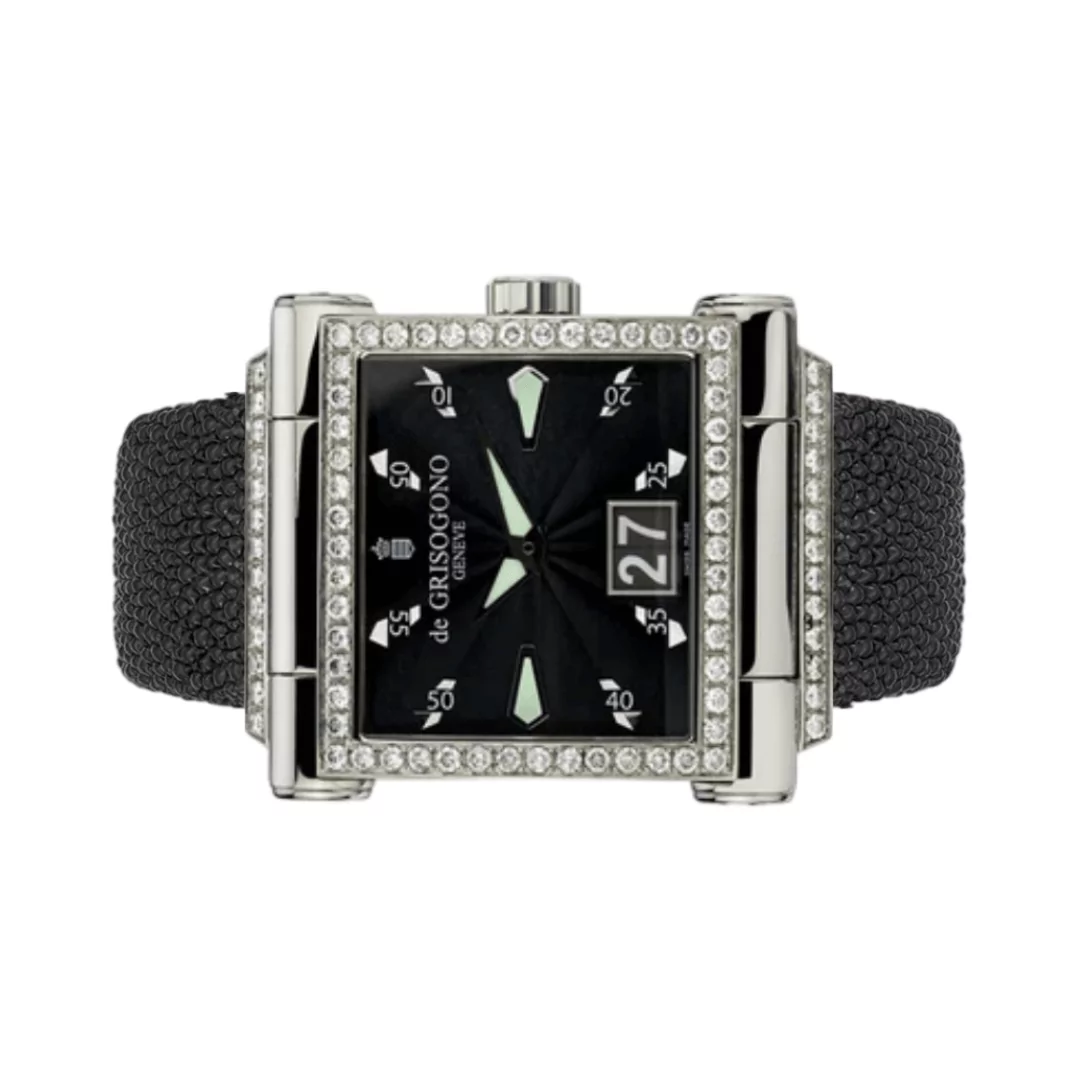 The De Grisogono Instrumento Grande N01 Diamonds Fixing Black Dial Unisex Watch is a perfect blend of elegance and precision. This exquisite watch showcases a stunning contrast of black and white, making it a timeless piece for watch collectors and luxury enthusiasts.