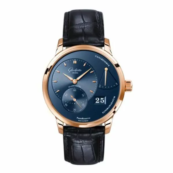 The PanoReserve represents a stylish interpretation of the characteristic asymmetric layout of the Pano dial: with an off-centre hour/minute display, a small second, the characteristic Glashütte Original Panorama Date and a power reserve indicator.