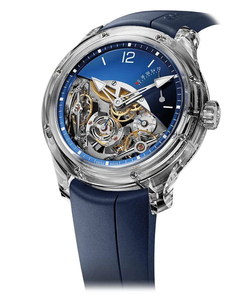 The sapphire crystal case measures 43mm in diameter and 13.38mm in thickness, showcasing the horological feat that lies within. The multi-layer construction of the movement and dial resembles a miniature city, with inclined balances that add an element of capricious intent. The symphony of visual ecstasy created by the movement architecture is a testament to the meticulous attention to detail.