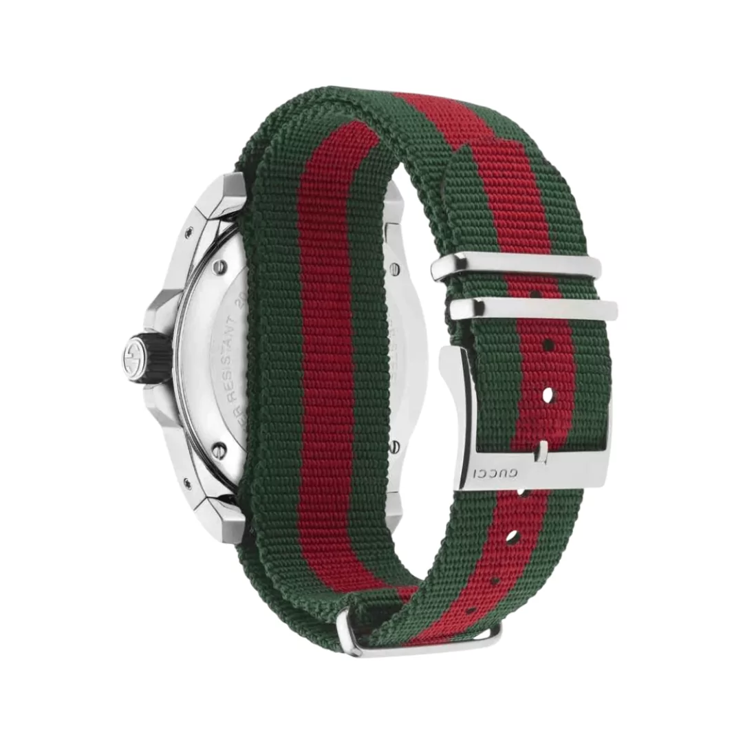 The iconic Green-Red-Green web nylon strap adds an unmistakable Gucci touch while providing durability and comfort. The secure fit and premium materials make it suitable for both casual and sporty wear.