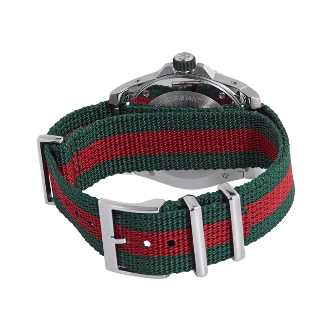 The Gucci Dive Quartz YA136339 is a standout timepiece with a strong and modern look. It features a bold 40mm stainless steel case paired with a striking green dial, making it perfect for both men and women. Its design blends fashion and function, making it a versatile accessory for daily wear or active use.