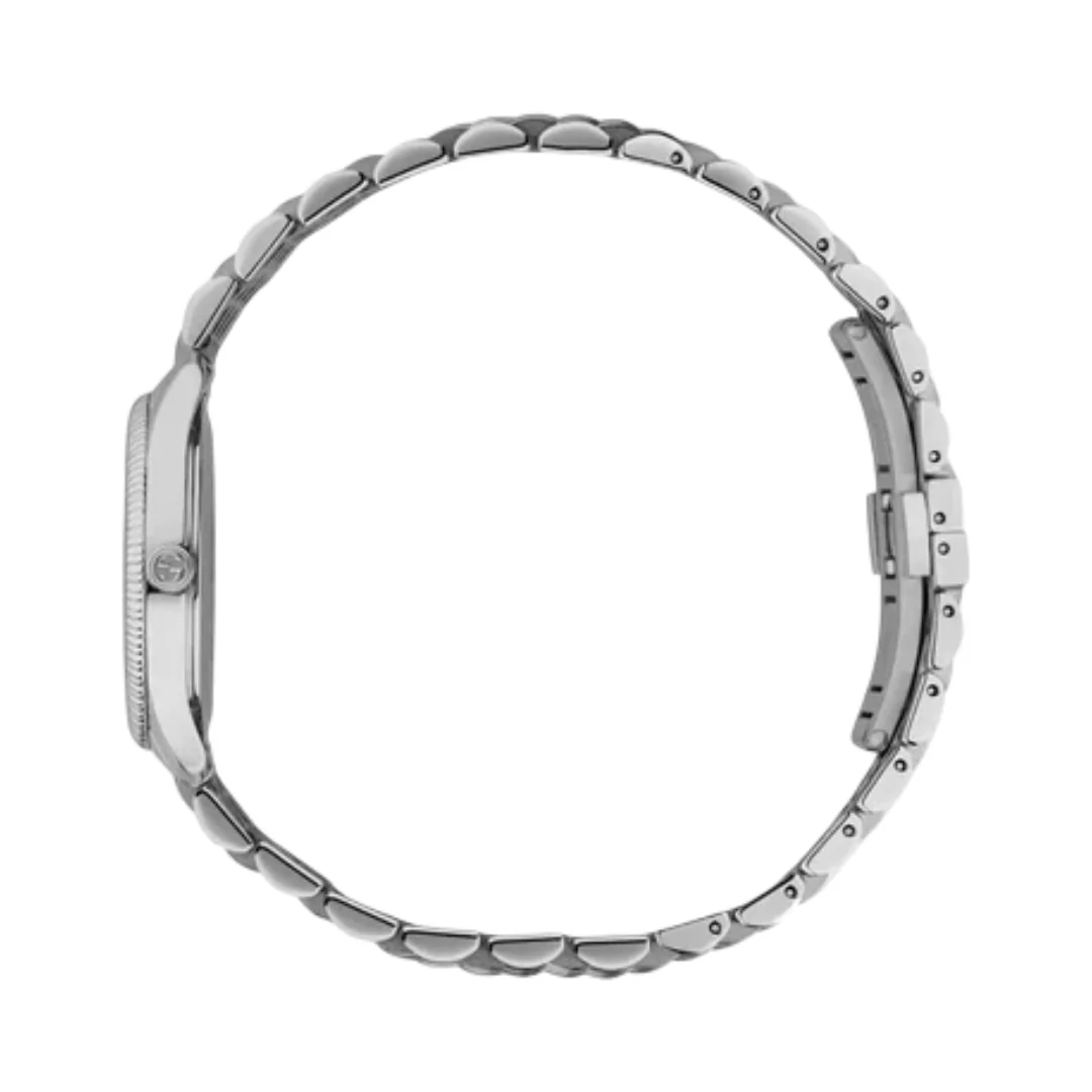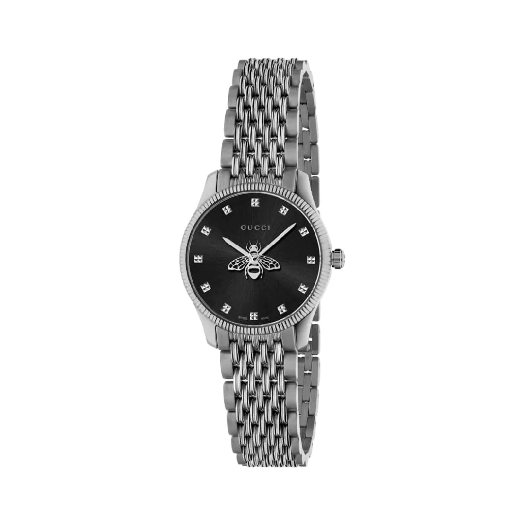 The Gucci G-Timeless Quartz YA1265020 is a classy women’s watch with a 29mm round stainless steel case. The black dial gives it a clean and stylish look, while the sapphire crystal dial window helps protect it from scratches in daily use.