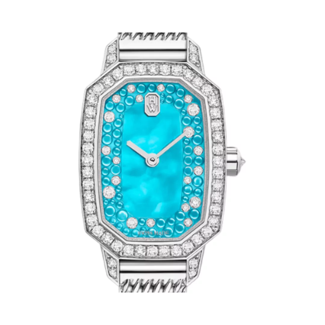 The Harry Winston Emerald EMEQHM18WW018 is a stunning women’s watch crafted from 18K white gold. It features an elegant turquoise mother-of-pearl dial, beautifully complemented by an 18K gold Emerald applique. The case, bezel, and bracelet are adorned with a total of 120 brilliant-cut diamonds, adding a touch of glamour.