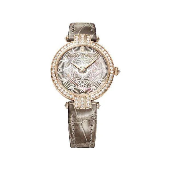 31mm 18kt rose gold case, quartz movement, Tahitian Mother Of Pearl With Pink Beaded Mother Of Pearl Lacework dial, fixed bezel, 18K Rose Gold Set With A Diamond crown, Taupe-Brown Leather strap, Sapphire – Anti Reflective crystal, water resistant to 30m/100ft.