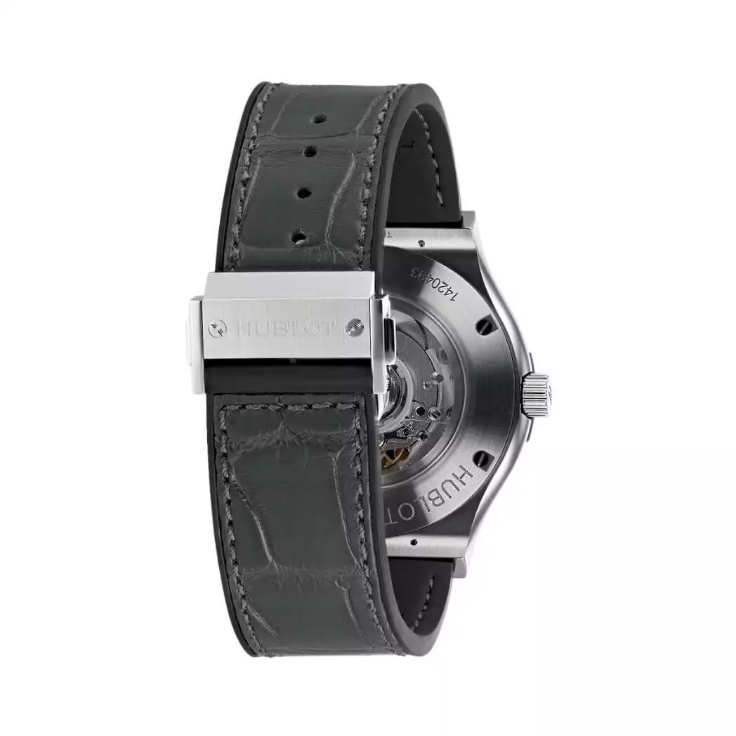 The Hublot Classic Fusion 511.NX.7071.LR comes with a black and grey rubber and leather strap, offering a comfortable and stylish fit. The combination of materials adds a unique touch to the overall design, making it suitable for various occasions.