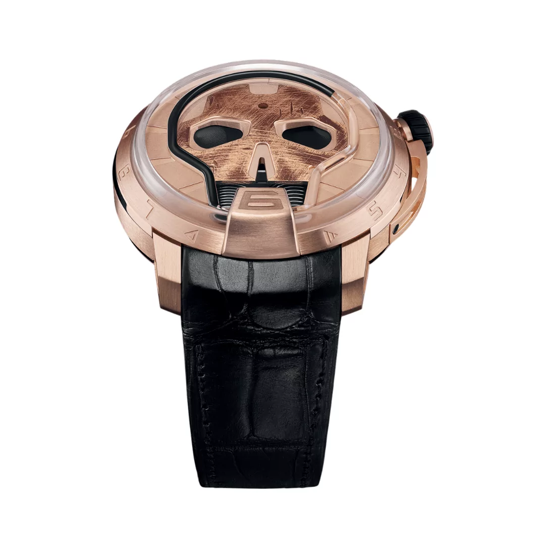 The HYT Skull S48-PG-57-NF-RF features a mesmerizing 3D transparent design. The digits, markers, and directive arrows appear to float, creating an extraordinary visual effect. The watch case is made of pink gold with a brushed and polished finish, adding to its luxurious appeal.