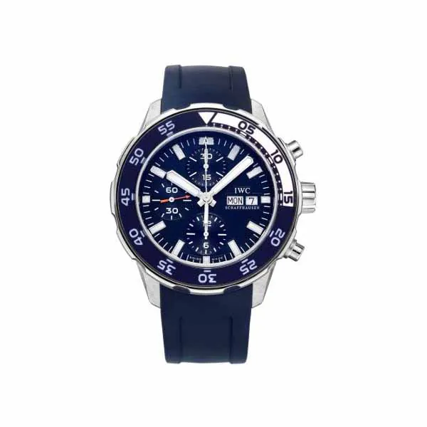 IWC Caliber 79320, beats at 28,800 vph, contains 25 jewels & has an approximate power reserve of 44 hours, 44mm stainless steel case, 15mm thickness, blue dial with bold applied index hour markers filled with?luminescent material, scratch resistant sapphire crystal, uni-directional rotating bezel, screw down crown, solid case back, blue rubber strap with quick-change system – spring loaded lever is located on the end of the?strap which easily allows for removing/replacing the strap, tang buckle clasp, automatic movement, water resistant to 120m/400ft.