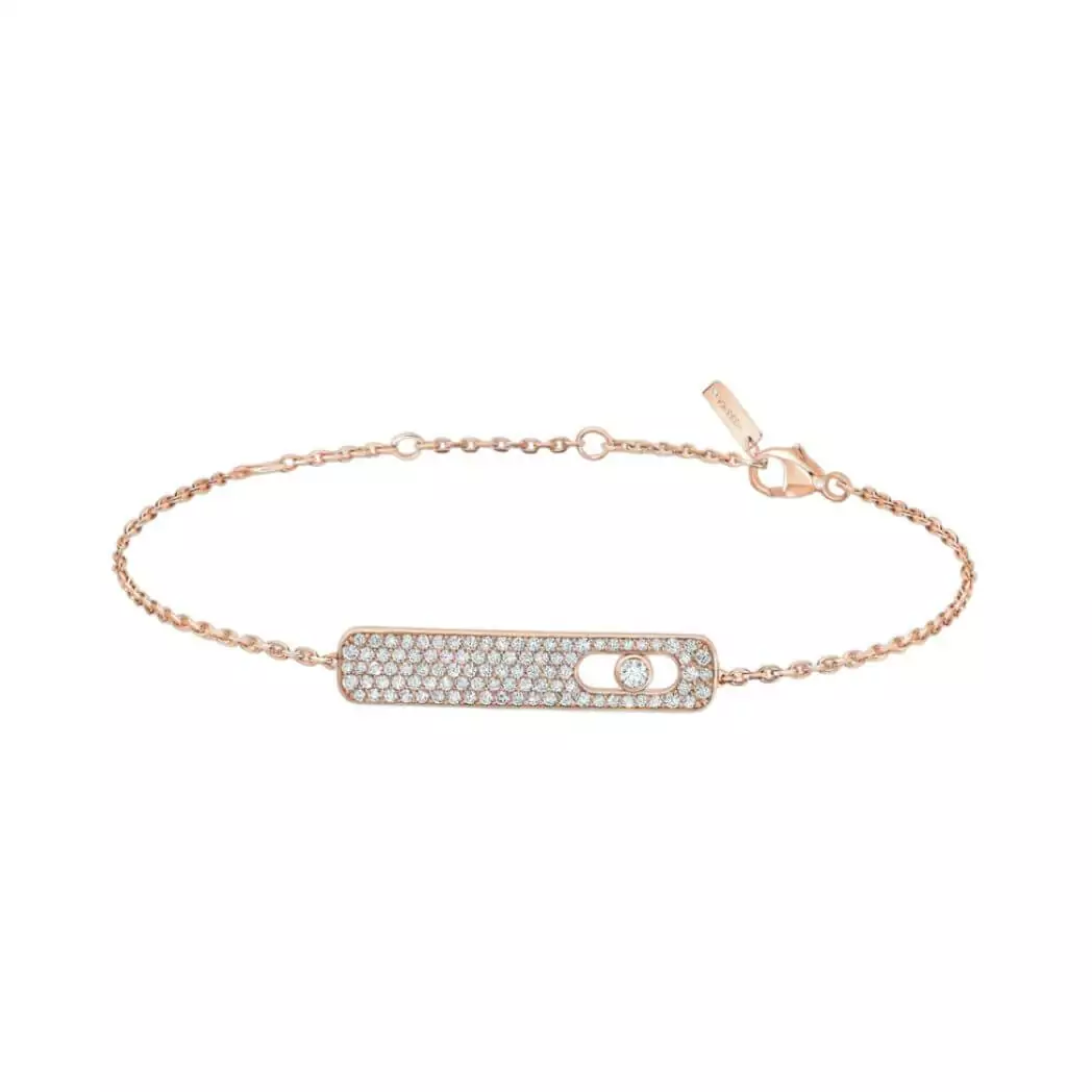 Made as part of the My First Diamond collection, this rose gold bracelet shows how Messika loves making things that are super fancy. The tiny diamonds, weighing 0.33 carats and being really good quality, shine brightly against the warm rose gold. The bracelet is 18 cm long and has five rings to adjust it, making it comfy to wear. The design, 23.3mm long and 4.4mm wide, mixes modern style with timeless beauty.