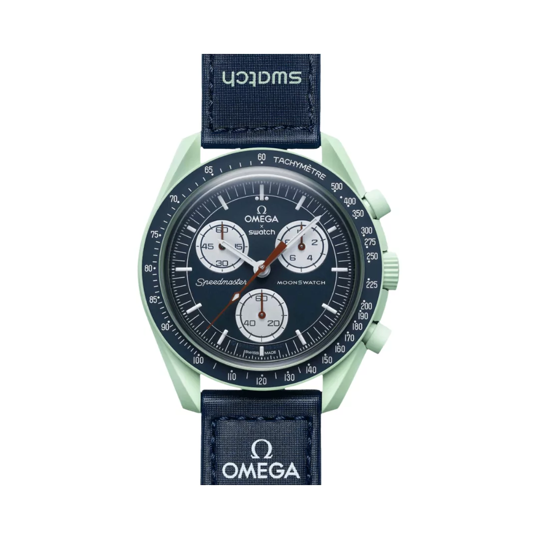 The Omega X Swatch Mission To Earth SO33G100 is a stylish unisex watch designed for eco-astronauts and watch enthusiasts alike. With a unique combination of earthy green and blue tones, this watch stands out as both a functional timepiece and a fashionable accessory.