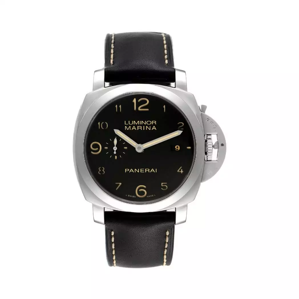 44mm AISI 316L stainless steel case, see-through sapphire crystal back, polished bezel, brushed steel device protecting the crown, black dial with luminous Arabic numerals and hour markers, date at 3 o’clock, seconds at 9 o’clock, automatic Panerai P.9000 calibre movement with hours, minutes, small seconds, date, approximately 3 days of power reserve, black leather strap. Water resistant to 300 meters.