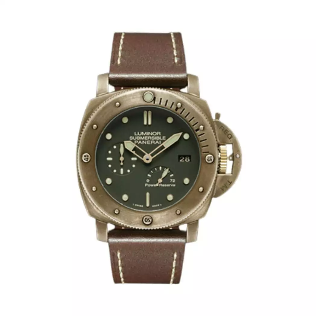 Discontinued model, Luminor submersible bronze 1950, 47 mm bronze case, power reserve 3 days, automatic movement, green dial, brown leather strap, water resistant to 300m/1000ft.