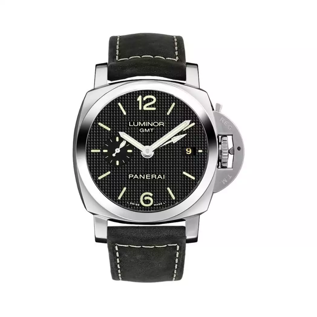 Panerai Luminor 1950 3 Days GMT Automatic Acciaio, 42 mm stainless steel case, black dial, P.9001 calibre automatic movement with hours, minutes, small seconds, date, GMT, power reserve indicator on the back, seconds reset, approximately 3 days of power reserve, black leather strap. Water resistant to 100 meters.