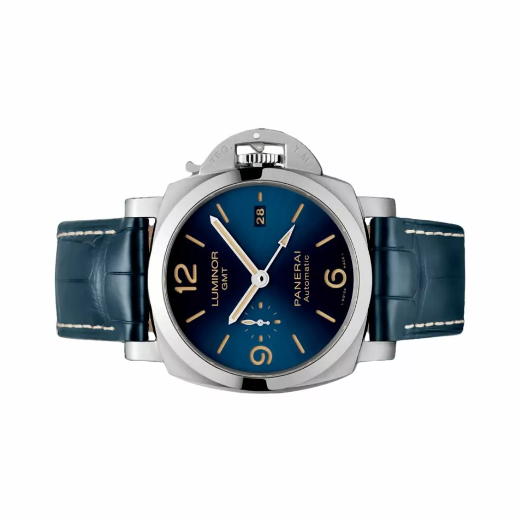 Elevate your style with the Panerai Luminor PAM01033, a timeless masterpiece designed by Panerai. The round stainless steel case and vibrant blue leather strap make a bold statement.