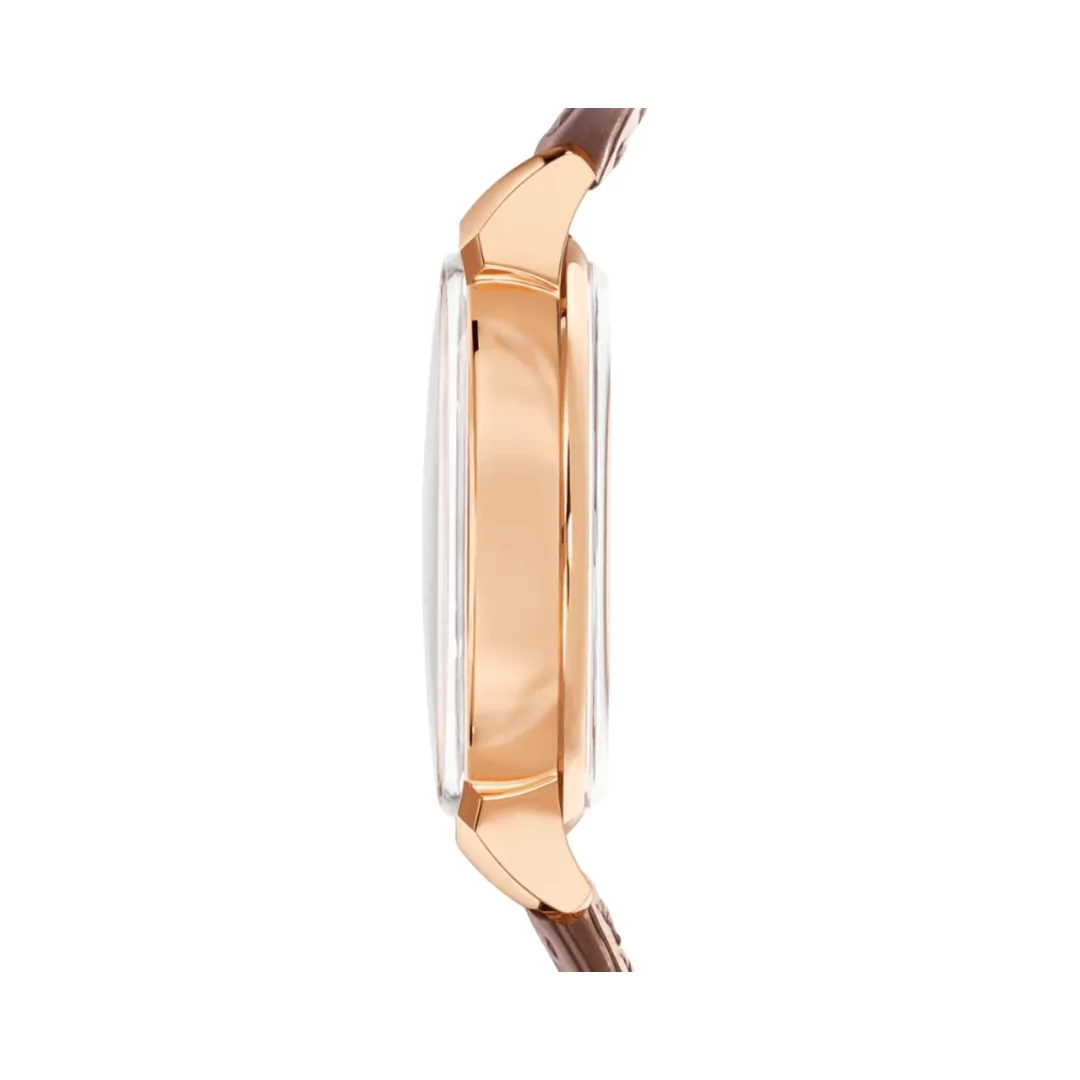 The shiny brown alligator leather strap, hand-stitched with square scales, ensures a comfortable fit. It is secured with a tang clasp, set with 27 diamonds, enhancing its luxurious appeal.