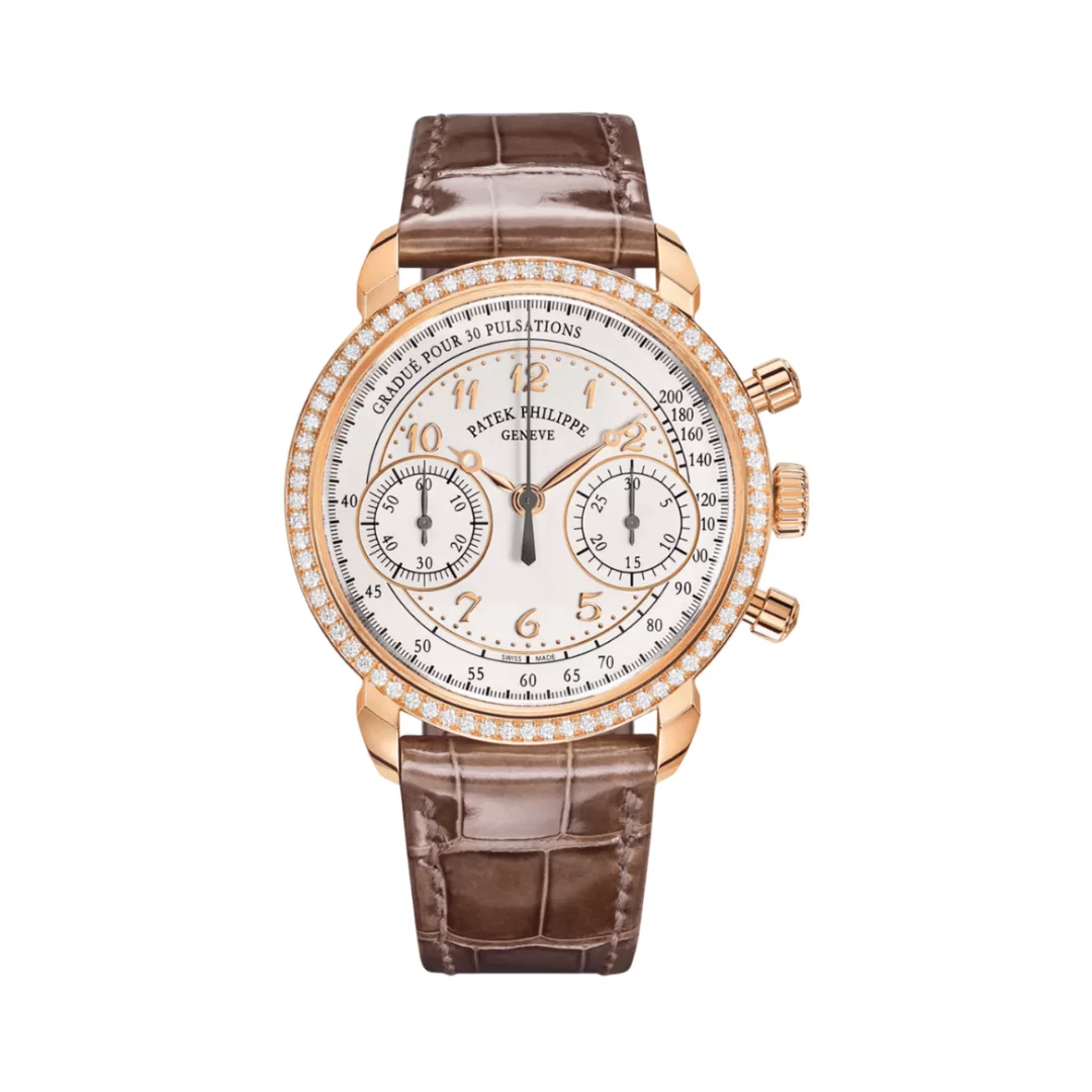 The silver dial is adorned with Arabic numerals, enhancing readability. It includes two sub-dials for 60 seconds and 30 minutes. The fixed bezel, crafted from 18k rose gold, is set with 72 diamonds totaling 0.78 carats, adding a touch of brilliance.