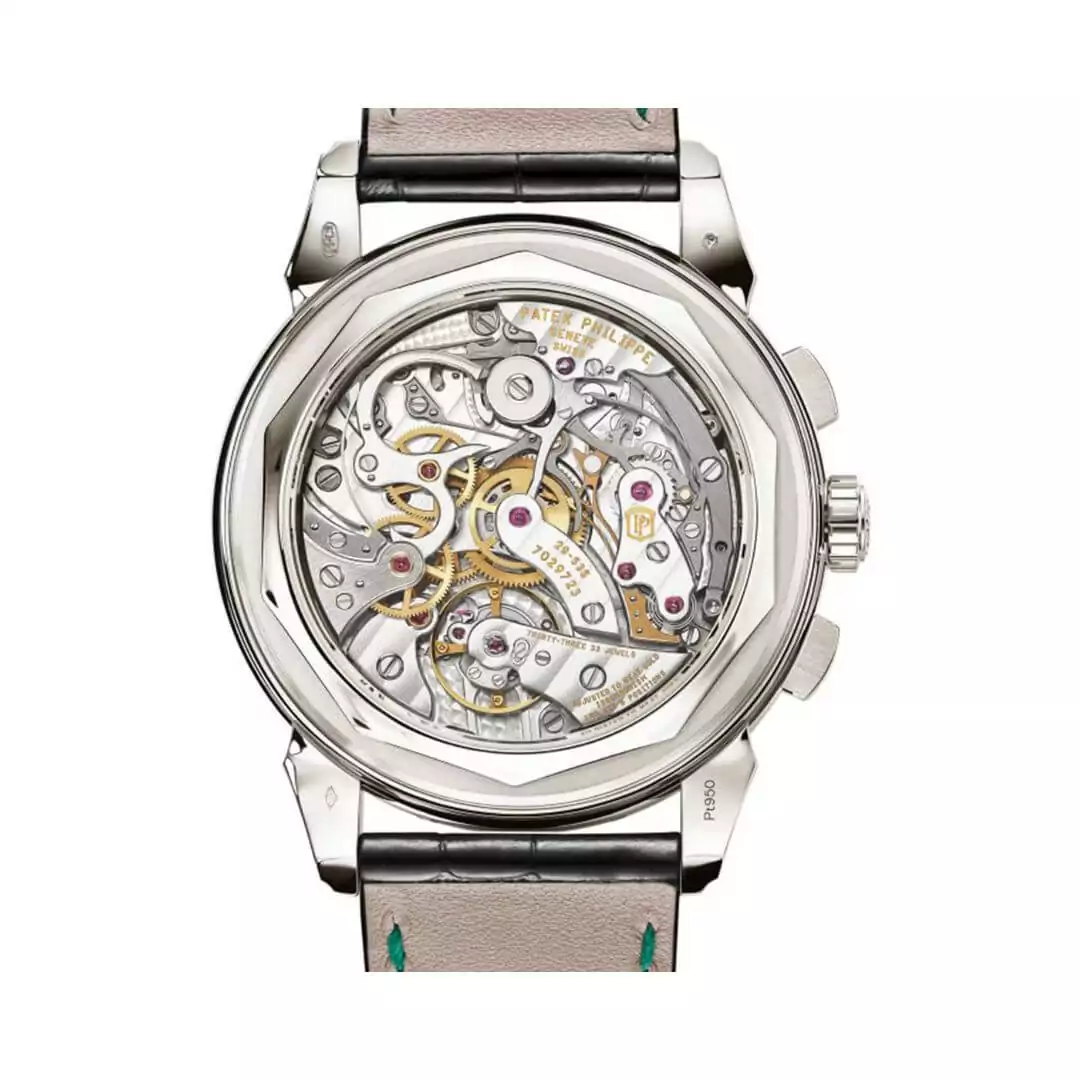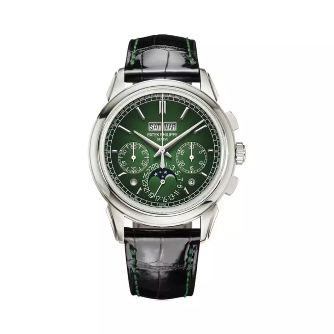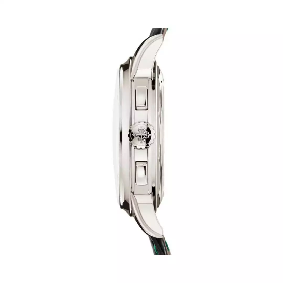 This men’s watch has a big 41mm case made of platinum and is 12.4mm thick. The back of the watch is see-through and made from a tough Sapphire crystal that doesn’t easily scratch. The watch’s round edge is also platinum and has a silverish look. The hour markers are lines with gold added for an extra fancy touch. The watch’s face is a nice green color, which adds a stylish touch.