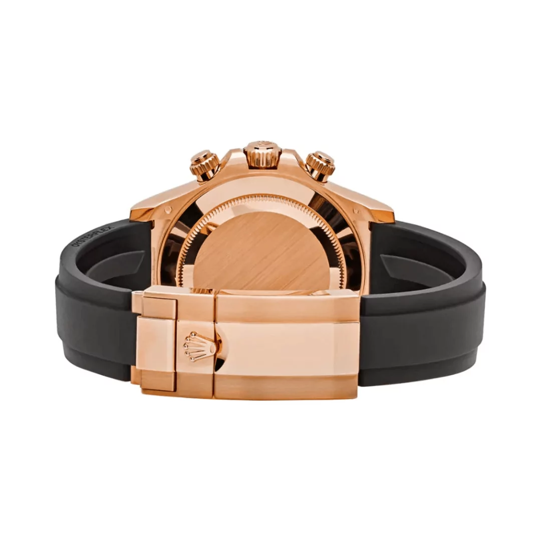 The black rubber Oysterflex bracelet offers both comfort and durability. It features a folding clasp made of 18-carat rose gold and includes the Oysterlock with Rolex Glidelock, ensuring a secure fit that’s also easy to adjust.
