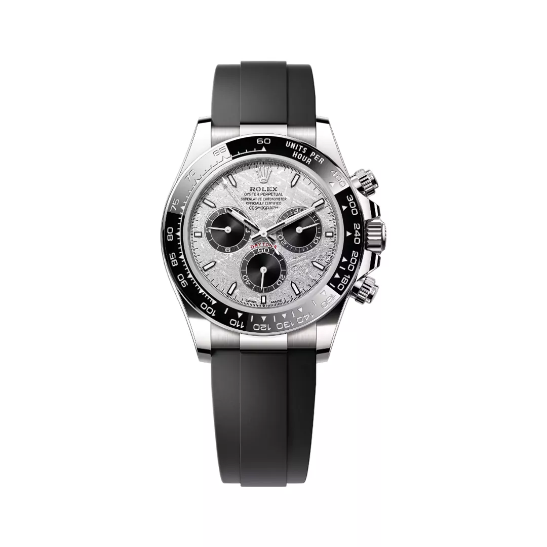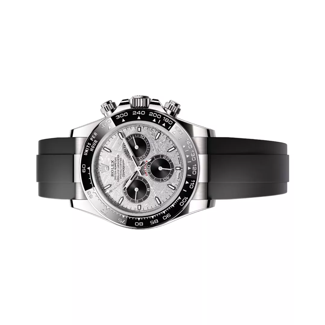 The Rolex Cosmograph Daytona is powered by Rolex’s in-house automatic chronograph movement, which provides remarkable reliability, precise timekeeping, and a solid power reserve suitable for demanding daily wear. The meteorite dial offers each watch a unique pattern, ensuring no two are same and adding uniqueness to an already desirable product. Polished white-gold pushers and crown, combined with a sophisticated bracelet or Oysterflex option, round off the elegant yet functional look.