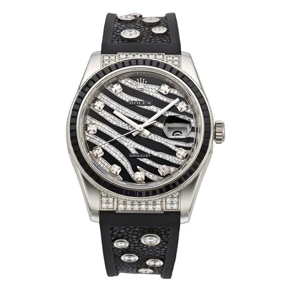 Rolex Datejust 116199 SANR features 36mm 18K white gold case, bezel set with 60 baguette black sapphires, bezel edge and endpieces set with diamonds, black and diamond paved dial, diamond hour markers, and black rubber and galuchat strap set with 10 diamonds.