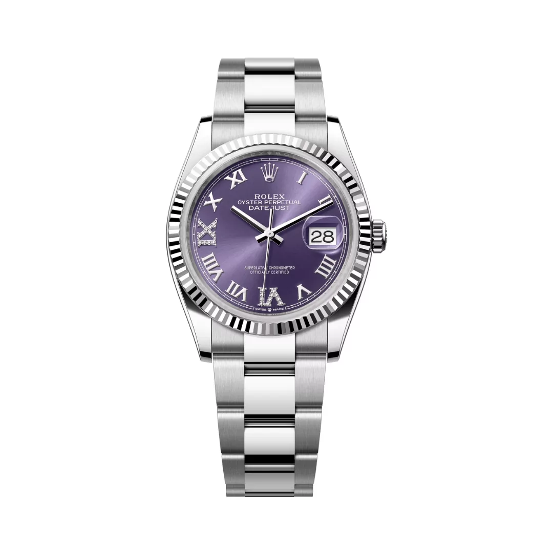 Rolex Datejust 126234 Aubergine 36mm Oystersteel case, screw-down steel back, screw-down crown with twinlock double waterproofness system, fluted bezel, scratch-resistant sapphire crystal with cyclops lens over the date, aubergine dial, Roman numerals with diamond set 6 and 9.