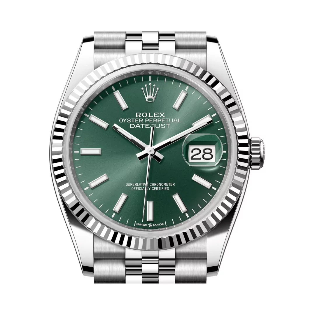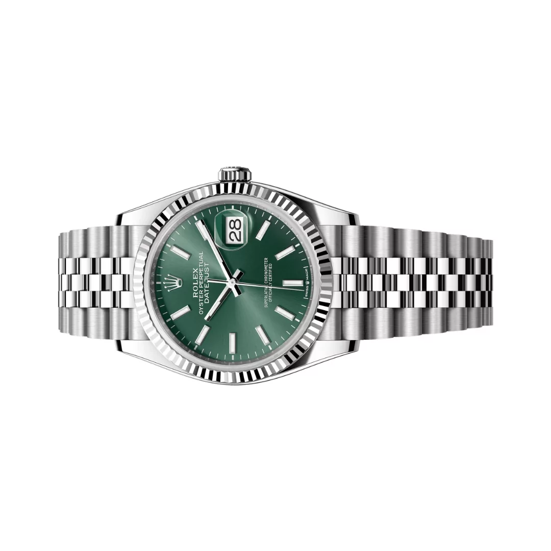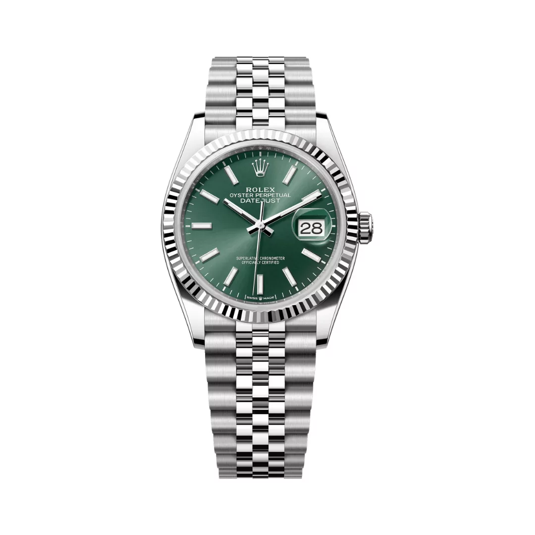 The 36mm Rolex Datejust 126234-0051 Oystersteel case has a sleek and robust appearance, which is enhanced by an 18k white gold fluted bezel that reflects light beautifully with each movement. The watch’s standout feature is its stunning mint green dial, a refreshing and contemporary color that gives a particular appeal to this timeless design. The dial has classic Roman numeral hour markers and the characteristic date window at 3 o’clock, magnified by the Cyclops lens for easy readability – a Rolex Datejust hallmark.