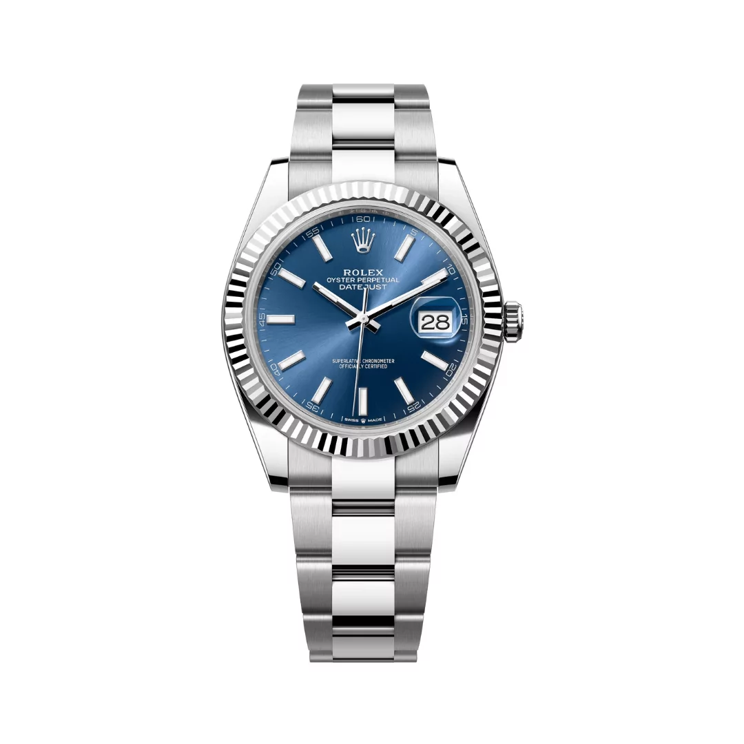 The Rolex Datejust 126334-0001 features 41mm white Rolesor case comprised of a 904L steel monobloc middle case, screw-down steel back, screw-down crown with twinlock double waterproofness system, 18K white gold fluted bezel, scratch-resistant double anti-reflective sapphire crystal with cyclops lens over the date, blue dial, index hour markers.