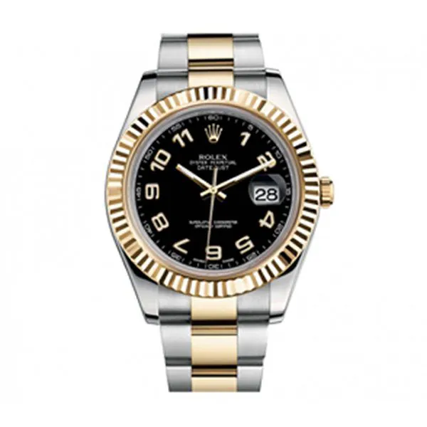 41mm Rolesor case in stainless steel with 18K yellow gold fluted bezel, black dial, Arabic numerals, and stainless steel and 18K yellow gold Oyster bracelet with Oysterclasp and Easylink extension link. Water resistant to 100 meters.