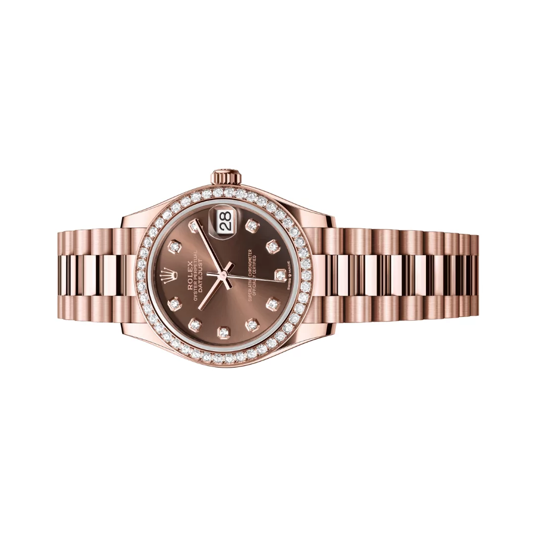 The Rolex Datejust m278285rbr-0006 31mm President Bracelet Everose Gold Ladies Watch appreciate luxury and style. This exquisite watch combines the renowned craftsmanship of Rolex with the beauty of 18 ct Everose gold and sparkling diamonds. With its classic design and exceptional features, it is a true symbol of sophistication.