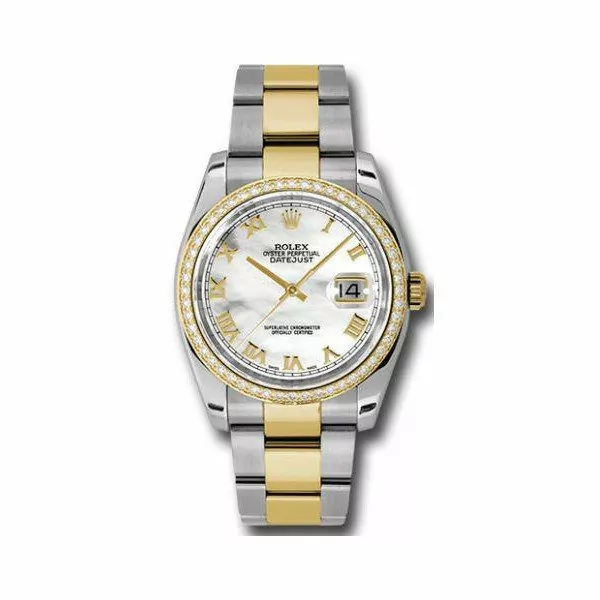 36mm stainless steel case, 18K yellow gold bezel set with 52 brilliant-cut diamonds, mother of pearl dial, Roman numerals, and stainless steel and 18K yellow Oyster bracelet.
