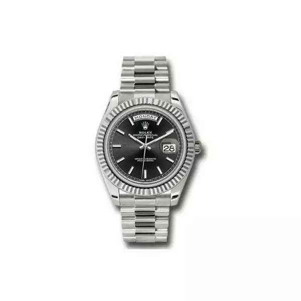 40mm 18K white gold case, screw-down back with Rolex fluting, screw-down crown with twinlock double waterproofness system, fluted bezel, scratch-resistant double anti-reflective sapphire crystal with cyclops lens over the date, black dial, index hour markers with Chromalight, Rolex calibre 3255 automatic movement with centre hour, minute and seconds hands, instantaneous day and date in apertures, unrestricted rapid-setting, and stop-seconds for precise time setting, approximately 70 hours of power reserve, President bracelet with three-piece solid links comprised of a polished center link, satin-finished outer links, and ceramic inserts, concealed folding Crownclasp buckle. Waterproof to 100 meters.