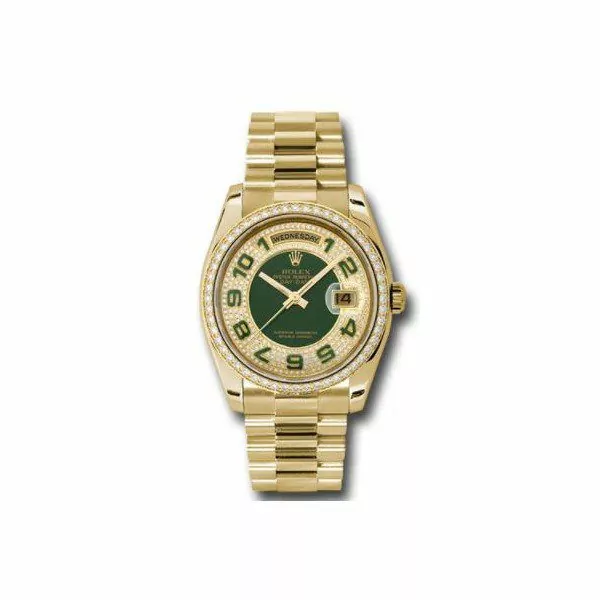 36mm 18K yellow gold case, bezel set with 52 diamonds, pave edge dial with green enamel center, green enamel Arabic numerals, and President bracelet.